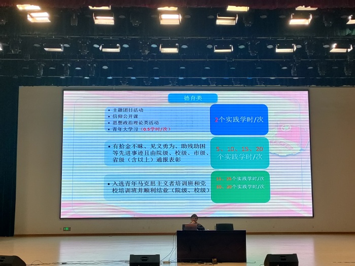 校团委时昕朦老师首先介绍了老员工艺术团的概况及招新要求。而后公司团委书记徐霞老师主讲,首先讲述第二课堂的意义、内涵、活动类型以及PU平台使用,重点解读了《太阳集团tyc539“第二课堂成绩单”制度实施办法》这一文件。她从德育、智育、体育、美育、德育五大模块逐条解读学时认定的规则和注意事项。