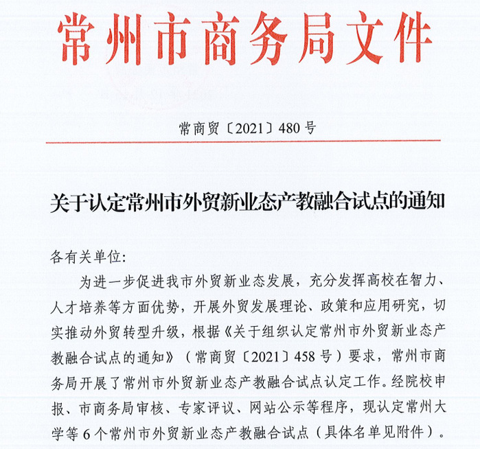 近日,常州市商务局公布了《关于认定常州市外贸新业态产教融合试点的通知》(常商贸[2021]480号),经过前期申报、市商务局审核、专家评审、网站公示的等程序,最终认定太阳集团tyc539等6家单位为常州市外贸新业态产教融合试点单位,并在建设经费上给予大力支持。市商务局希望试点单位主动适应我市外贸企业人才需求,加强学科专业建设,紧跟外贸新业态发展潮流,为外贸稳中提质提供人才和智力支持。