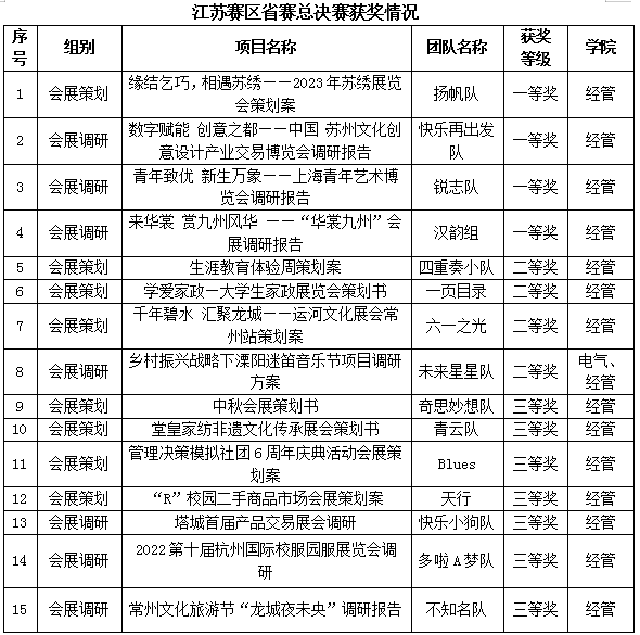 10月15日至16日,全国高校商业精英挑战赛会展专业创新创业实践竞赛江苏赛区省赛总决赛在线上举行。经过评审,公司获得最佳院校组织奖,一等奖4项、二等奖4项、三等奖7项。获得一二等奖的团队晋级国赛。