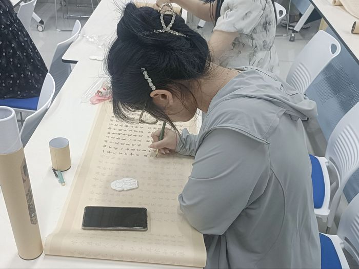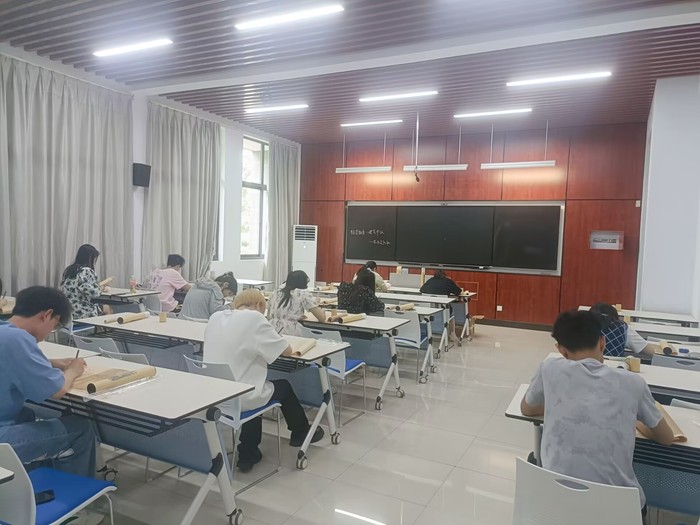 此次活动准备了硬笔书法所需的整套工具,形式新颖,吸引众多同学参与其中。在书写现场,同学们屏气凝神,用心书写每一个笔画、每一个汉字,最终一卷卷字帖被渲染上新的色彩,被重新赋予了生命。每个人字帖上的内容不尽相同,在临摹的同时,可以透过笔下的诗词与古人进行思想交汇,用心去体味中华书法艺术之美。