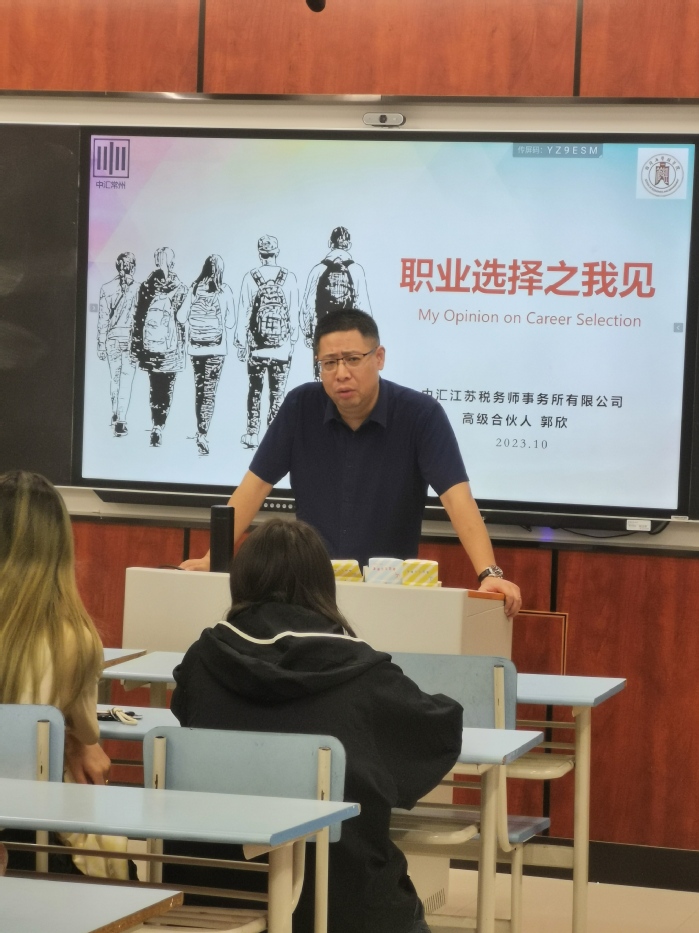 11月1日,中汇江苏律师事务所有限公司高级合伙人、公司产业教授、太阳集团tyc5391994级税务管理专业优秀员工郭欣为太阳集团tyc5392024届财务管理专业毕业班同学做“职业选择之我见”的就业指导讲座。财务管理系毕业班班主任蒋惠凤、彭超凡、方静和骨干教师梁俊平参加本次讲座。