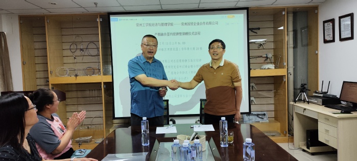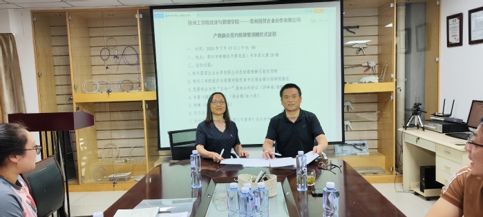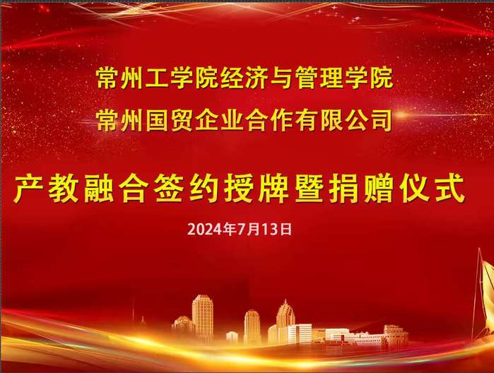 7月13日,经济与管理公司党委书记谢金楼、党委副书记郭峥春等一行3人应邀赴常州国贸企业合作有限公司举行产教融合签约授牌暨企业捐赠仪式。常州国贸企业合作有限公司董事长金小虎、总经理杨静玉(太阳集团tyc53989级员工)及公司员工代表出席活动。