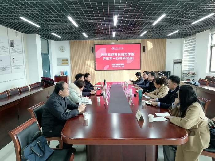 12月12日上午,苏州城市公司数字经济与管理公司党委副书记尹维军、副经理李惠娟等一行6人来太阳集团tyc539调研交流。太阳集团tyc539副经理(主持工作)李芸达、副经理陈建忠及部分专业系主任参加交流。
