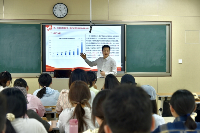 课堂伊始,韩建刚从我国丰硕的民生保障成果切入,指出新中国成立以来,人民生活水平显著改善,并结合当前形势,分析了生态保护、国家安全、外交外贸等领域的重要政策与实践,阐明我国经济结构不断优化,基础设施建设实现跨越式提升,人民生活水平显著改善,全面建成小康社会目标如期实现。这些成就体现了中国特色社会主义制度的优越性,并为全球发展合作提供了“中国方案”。他希望同学们树立大局观和明确责任感,将个人发展与国家命运融为一体。