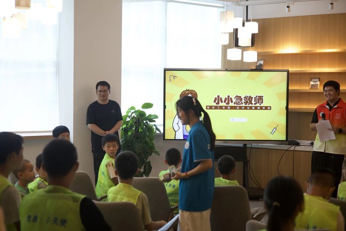 在活动中,“童心筑梦爱常相伴”七彩假期团队的志愿者们通过图文并茂的宣讲向小朋友们讲述了急诊科医护人员们的感人故事。他们的英勇事迹和无私奉献精神,深深打动了在场的每一个人。随后,常州市肿瘤医院的医护人员们亲自上阵,指导小朋友们进行海姆立克急救法、进行心肺复苏等急救知识的实操演练。五年级员工王乐乐在体验后表示:“原来按压位置偏一点都可能耽误抢救,医护叔叔阿姨太厉害了!”