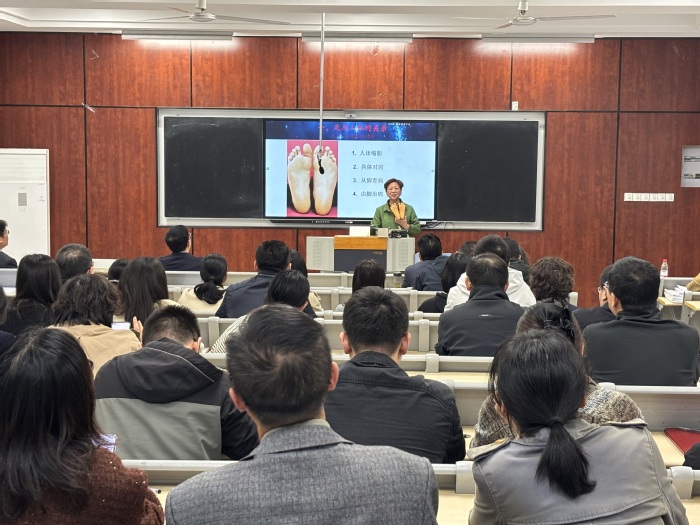讲座伊始,徐晓寅以“人体第二心脏”的生动比喻切入,深入浅出地揭示了双足在健康中的关键作用。她介绍道,足部分布着与人体各脏腑器官相对应的反射区,是反映身体健康状况的“重要窗口”。对于长时间伏案工作和频繁使用电脑的教师群体,易患颈椎病、肩周炎、腰背痛等职业病,通过足疗可以有效缓解这些身体不适,促进血液循环、疏通经络,减轻肌肉疲劳、缓解心理压力,提升整体健康水平。